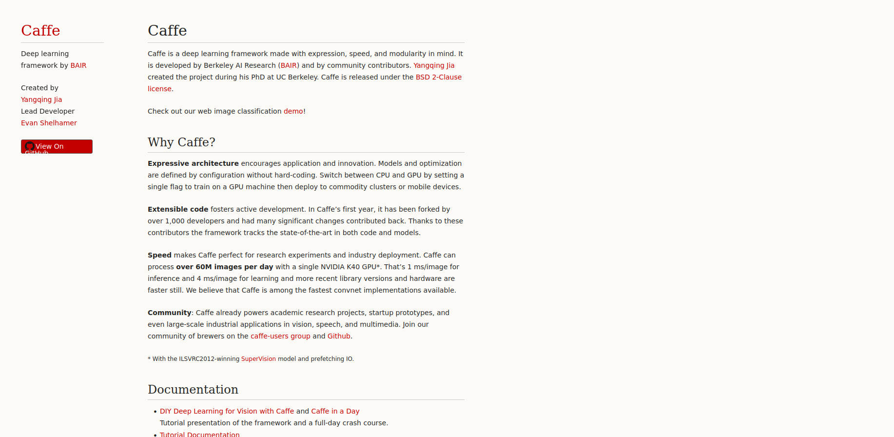 Fue creado por Yangqing Jia durante su doctorado en la Universidad de California, Berkeley, en el laboratorio Berkeley Vision and Learning Center (BVLC), y puesto a disposición de la comunidad en 2014 bajo licencia BSD.