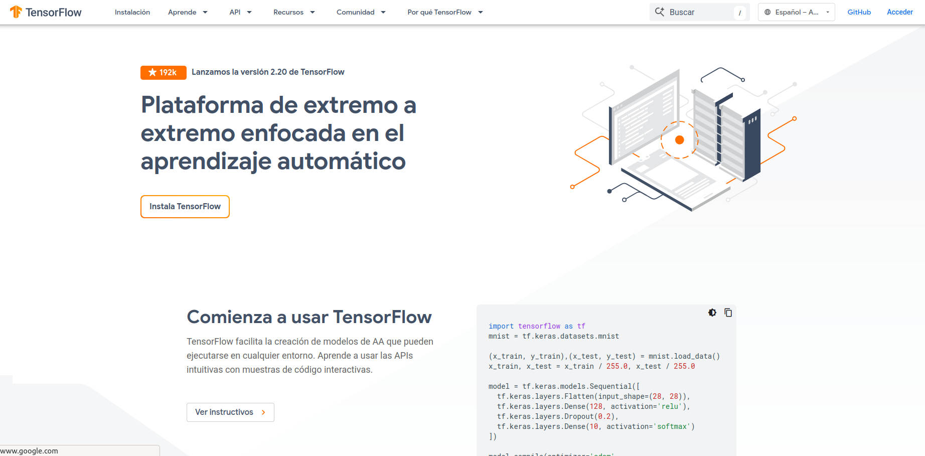 - TensorFlow es la plataforma open source líder para crear, entrenar y desplegar modelos de machine learning y deep learning con soporte de Google y una comunidad global.